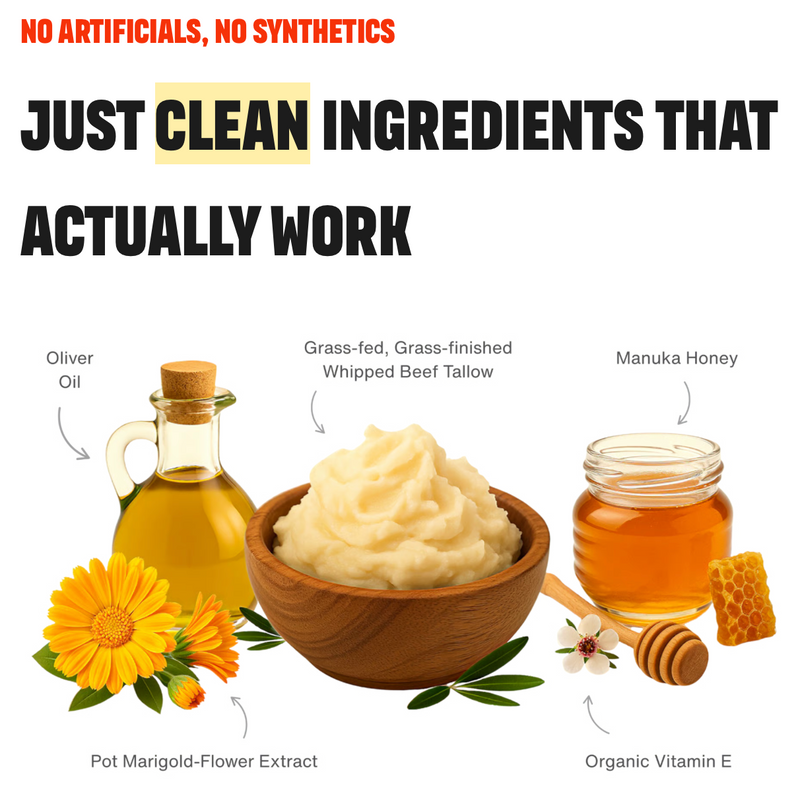 Our Tallow Balm contains only 4 natural ingredients: grass-fed, grass-finished beef tallow, cold-pressed organic olive oil, pot marigold extract, and organic vitamin E. We use manuka honey in some variations for its additional healing properties. No fillers, no chemicals, just raw, unadulterated skin nutrition that lets your skin thrive naturally.