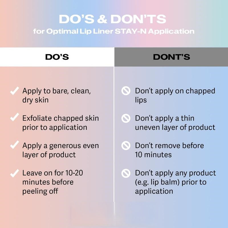 Enjoy flawless lips that last all day with up to 12 hours of wear. This peel-off lip liner is completely smudge-proof, transfer-proof, and water-resistant, keeping your lip look sharp from morning to night.